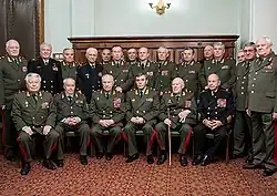The Group of Inspectors General of the Soviet Ministry of Defence was established on 12 February 1958 under order No. 037 of Defence Minister Rodion Malinovsky, on the basis of decree No. 149-63 of the Council of Ministers of the Soviet Union on 30 January 1958. This was intended to establish "for use in In the Armed Forces, the accumulated knowledge and experience of marshals, admirals, army generals, colonel generals and some lieutenant generals and vice admirals who have reached such an age when, for health reasons and the prospects for their further use, cannot continue to work with a full load ..."[1] By the late Soviet period it had become a sinecure position for senior officers. Its numbers were reduced by Defence Minister Dmitry Yazov in 1988, and it was abolished during the 1992 reforms of Marshal Yevgeny Shaposhnikov.[2][3] At the time of its abolition it consisted of 53 senior officers.[1]