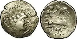 Eugène Hucher connected Lucian's image of Ogmios with coin-type from Armorica, on one side of which is depicted a beardless male bust with a number of pearl-like chains extending from his head. Any relationship of this coin-type with Ogmios is largely rejected now, following arguments by Charles Robert,[3]: 91 who pointed out that the coins appear to be copies of Greek staters of Philip II, and in any case diverge from Lucian's Ogmios insofar as the coins depict a young man, with chains emerging from his head rather than his mouth, and no faces on the end of these chains.[26]: 270–271 De Vries accepts the possibility that these coins represent a different iconographic variety of Ogmios, known in the north of Gaul.[4]: 66