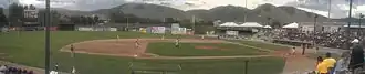 The field dimensions are 309 feet (94 m) down the left field line, 398 feet (121 m) to center field, and 287 feet (87 m) down the right field line, which includes a 27-foot-high (8.2 m) wall. Just south of the Clark Fork River, the natural grass field is aligned northeast (home plate to second base) at an approximate elevation of 3,200 feet (975 m) above sea level.