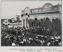 The Ohinemuri County Council first met on 17 November 1885.[1] It was formed from a portion of Thames County.[2] A 1919 petition[3] resulted in loss of the western part of the area[4] to a new Hauraki Plains County in 1920.[5]