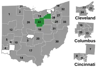 Ohio's 22nd senatorial district has historically been based in north central Ohio. It now consists of the counties of Medina, Ashland, Richland, and a portion of Holmes County. It encompasses Ohio House districts 2, 69 and 70. It has a Cook PVI of R+18. Its Ohio Senator is Republican Mark Romanchuk.