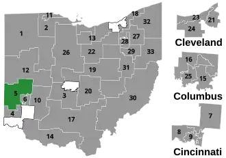 Ohio's 5th senatorial district centers on Dayton and currently consists of the counties of Miami and Preble along with portions of the counties of Darke and Montgomery. It encompasses Ohio House districts 39, 43 and 80. It has a Cook PVI of R+20. Its current Ohio Senator is Republican Steve Huffman.