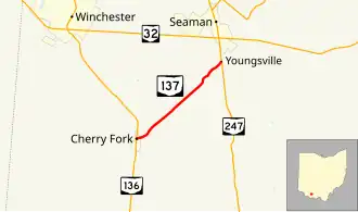 State Route 137 (SR 137) is a short north–south state highway in the southwestern portion of Ohio. Its southern terminus is at a T-intersection with SR 136 in Cherry Fork, and its northern terminus is another T-intersection, this time with SR 247 just south of Seaman.