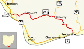 State Route 243 (SR 243) is an east–west state highway in the southern portion of the U.S. state of Ohio. The western terminus of SR 243 is at a diamond interchange with the U.S. Route 52 (US 52) in Coal Grove. The eastern terminus of the state highway is at its signalized junction with State Route 7 approximately 1.25 miles (2.01 km) west of Proctorville near the northern banks of the Ohio River.