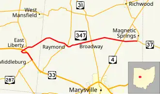 State Route 347 (SR 347) is an east–west state highway in central portion of the U.S. state of Ohio. The western terminus of SR 347 is at SR 287 near Middleburg, adjacent to the U.S. Route 33 freeway. Its eastern terminus is at a T-intersection with SR 37 just one-quarter mile (0.40 km) south of the village of Magnetic Springs. The route runs through rural areas of Logan and Union counties passing through no incorporated villages.