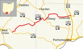State Route 348 (SR 348) is an east–west state highway in the south central portion of the U.S. state of Ohio. Its western terminus is at State Route 125 approximately 6 miles (9.7 km) east of West Union, and its eastern terminus is at U.S. Route 23 just north of Lucasville – this is also the western terminus of State Route 728.