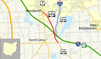 State Route 626 (SR 626) is a north–south state highway in the northeastern portion of the U.S. state of Ohio. The southern terminus of SR 626 is at SR 165 approximately one and a half miles (2.4 km) southeast of the hamlet of North Lima. Its northern terminus is at SR 7 nearly two miles (3.2 km) south of the township of Boardman.