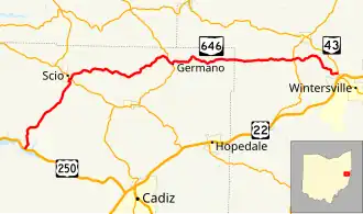 The first segment of SR 646 designated as a state highway was in 1937 on the route connecting Scio with its present eastern terminus at SR 43 near Wintersville.[4][5] At its inception as a state route, most of the road was gravel-paved, though a short segment near Scio was asphalt-paved and another segment near the eastern terminus was dirt.[5] More segments were paved until the 1960s when the road was fully paved.[6]