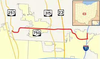 State Route 750 (SR 750) is an east–west state highway located in central Ohio. The western terminus of the state highway is at a signalized intersection with SR 257 nearly 2.5 miles (4.0 km) west of Powell, just outside the Columbus Zoo and Aquarium. The highway travels east to Highbanks Metro Park and Polaris Fashion Place. The eastern terminus of SR 750 is at Interstate 71 (I-71) in the far northern reaches of the city of Columbus. The route was designated in 1937, and both termini were rerouted. The eastern terminus was extended east in 1997, and the western terminus was rerouted south in 2007.