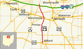 State Route 99 (SR 99) is a north–south state highway in the north-central portion of the U.S. state of Ohio. The highway's southern terminus is in the southern end of Willard at a T-intersection with U.S. Route 224 (US 224). Its northern terminus is at a roundabout junction with SR 4 about 6 miles (9.7 km) southwest of the city limits of Sandusky.