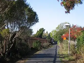 For most of its length, the Ohlone Greenway runs along what was formerly a railroad right of way, and alongside the elevated tracks of the BART Richmond line. For most of this stretch, the Greenway is divided into two paths, one for pedestrians, the other for bicyclists. The segment from the North Berkeley BART station to Rose Street in north Berkeley was formerly the right of way of the Key System's "G" Westbrae line. The segment from Rose to just north of the El Cerrito del Norte BART station was formerly the right of way of the Santa Fe Railroad (and originally, of the California and Nevada Railroad). BART began revenue operation along the elevated tracks on January 29, 1973 and the last Santa Fe run over the route was on May 12, 1979,[2] meaning it was possible to see both a BART train and a Santa Fe freight train alongside each other (the BART train above on the overhead elevated tracks) in the right of way which became the Ohlone Greenway. The "linear park" was constructed in conjunction with BART, and received federal funds for landscaping and beautification.[3] The initial 2.7 miles (4.3 km) was funded by a $400,000 federal grant.[4]