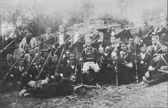 After their initial success in arming several villages in Kastoria, Kalchev went to the German occupied zone in order to start arming villages in Edessa region.[18] In Edessa, with the help of the German occupation authorities, Kalchev created the Ohrana para-military unit.[15] In 1943, Ohrana detachments counted a total of around 3,000 members and organized guerrilla activity. In the tradition of the IMRO Komitadjis, these bands pursued the local Greek population, including Greek-identifying Slavophones, Aromanians, and Pontic Greeks, seeing them as an obstacle to an all-Bulgarian Macedonia.[19] The main leaders during the early phase of activity from 1941 to 1942 were Tsvetan Mladenov and Andon Kalchev in the Florina prefecture, where there were 600 men under arms.