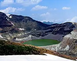 Okama (Japanese: 御釜), meaning an honourable cauldron, is the inactive volcanic crater (crater lake) on top of Mount Zaō, located in Kawasaki, Miyagi, on the border with Yamagata, Japan. While local people call it affectionately Okama, the visitors tend to call it Goshiki-numa (五色沼), meaning "Five Color Pond", because its color changes depending on the time of the day, the weather, or the season of the year.