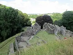 The castle bailey contained a number of buildings by the 14th century. On the north side were the Great Hall, the buttery and the castle kitchens, the former lit by a large decorative window and partitioned from the kitchen and buttery by a wooden screen.[49] Above the buttery was a luxurious solar, or apartment.[50] On the south side of the bailey were the western lodgings, well-equipped accommodation for guests, built by in-filling part of the ditch between the motte and the bailey, and later converted into a bakery.[51] A chapel and accommodation for the castle's chaplain lay alongside, and the chapel has remaining plaster work, which shows that the walls were painted with red lines to resemble ashlar cut stone.[52] On the far side of the chapel were the eastern lodgings, whose detailing mirrored those at Tiverton Castle, another de Courtenay property built in the same period.[53]