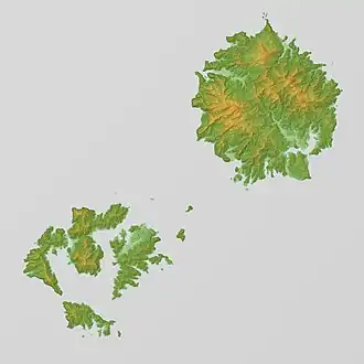 Dōgo to the east is the largest island in area, and has the highest elevation, Mount Daimanji, at 608 metres (1,995 ft) above sea level. The Dōzen group of islands to the west are all portions of single ancient volcanic caldera which collapsed, leaving three large islands (Nishinoshima, Nakanoshima and Chiburijima) and numerous smaller islands and rocks in a ring formation surrounding a central lagoon.[2] The archipelago is approximately 40-80 kilometres (43 nmi) north of Honshu coast at its closest point. For administrative purposes, the Japanese government officially considers the disputed islet of Liancourt Rocks (Dokdo or Takeshima) to be a part of the town of Okinoshima on Dōgo.