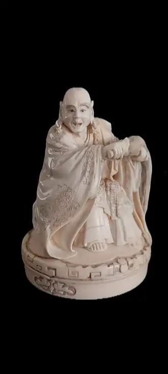 This small ivory okimono represents a Rakan, an iconic figure in Buddhism embodying wisdom and compassion. The Rakan symbolizes enlightenment and serves as a model for Buddhist monks.