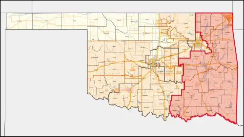 Oklahoma's 2nd congressional district is one of five United States congressional districts in Oklahoma and covers approximately one-fourth of the state in the east. The district borders Arkansas, Kansas, Missouri, and Texas and includes (in whole or in part) a total of 24 counties.[3] With a Cook Partisan Voting Index rating of R+28, it is the most Republican district in Oklahoma, a state with an all-Republican congressional delegation.[2]