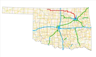 State Highway 11 (abbreviated SH-11) is a state highway in Oklahoma. It runs in an irregular west-to-east path 204.9 miles (329.8 km) across the northern part of the state, from U.S. Highway 281 (US-281) seven miles (11 km) north of Alva to Interstate 244 (I-244) / US-412 in Tulsa. There is one letter-suffixed spur highway branching from SH-11, SH-11A.