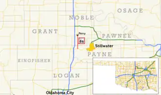 State Highway 86 (abbreviated SH-86) is a state highway in the U.S. state of Oklahoma that connects SH-51 with Perry and is 12.06 miles (19.41 km) long. The highway is contained wholly in Payne and Noble Counties. SH-86 has no lettered spurs or loops.