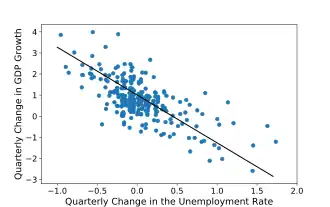 The graph at the top of this article illustrates the growth rate form of Okun's law, measured quarterly rather than annually.