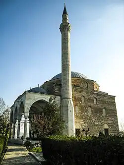 Also known as the Decorated (Aladža) Mosque because of the floral decorations, inscriptions and coloured tiles found on its walls, the Ishak Bey Mosque was constructed in 1438 in the northern part of the Old Bazaar. The mosque's minaret rises 30 meters (98.4 feet). There is a türbe located behind the mosque.[23] Within this mosque was one of the first Islamic libraries in Europe.[24]