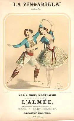 Professor Risley & Sons, a popular gymnastics act, was on the bill for two weeks in October.[48] The popular Italian ballerina Giovanna Ciocca, with Gaetano Morra,[49] played two weeks. The French Ballet Company directed by Victor Bartholomin and featuring Hippolyte Monplaisir and his wife Adèle Monplaisir was on the bill from October 21 to November 29. Another French ballet company played April 3 – 15, starring Mlle. Hermine Blangy, with Mons. Bouxary, in L'Illusion d'un Peintre and Giselle. Anna Bishop's Dramatic Company presented Lucrezia Borgia in Italian and Linda of Chamouni in English. The Monplaisirs returned on July 6 for four weeks (sans Bartholomin), presenting the ballets L'Almee and Le Diable a Quatre.