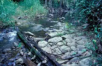 A natural sand deposit on the southern bank of the creek is encroaching onto the crossing, and plant shoots are growing between the stone pitching. The log at the southern aspect is exposed for only a small portion, less than 50 centimetres (20 in), the remainder being covered by encroaching sand deposits, up to an approximate depth of 20 centimetres (7.9 in). Sediment deposits currently extend to approximately 4.6 metres (15 ft) from the point of the southern sleeper into the fording.[1]