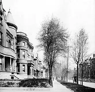 Country estates had been built in the area as early as the 1830s, and some of Louisville's great early mansions, predominantly in the Italianate style, were built along Broadway, very near Old Louisville, before the Civil War. Development from 1850 to 1870 occurred between Broadway and Kentucky Street, the northern extreme of what came to be called Old Louisville.[8] North-south city streets were extended throughout the area in the 1850s,[9] and a mulecar line was extended down Fourth to Oak in 1865.[10]