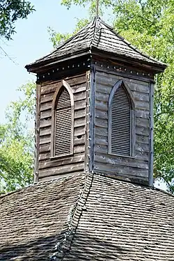 The Old Market is four-sided (24 feet each) open-air shed with a pyramid-shaped roof. There is a steeple at the top containing a bell. Four heavy wooden timbers support each side. A new roof and a cement floor were added to the structure in the 1950s, and the timbers (which are now badly rotted) were later reinforced with iron.[5]