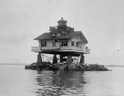 Old Plantation Flats is a shoal paralleling the Eastern Shore near the mouth of the bay, taking its name from Old Plantation Creek which empties into the bay near the center of the shoal. A square screw-pile light was erected on the shoal in 1886. It was constantly plagued by ice floes, with the original lens being destroyed in 1893, and more substantial damage done in 1918. After the latter the piles were reinforced with concrete and surrounded with rip-rap. The resulting structure was unlike any other in the bay.