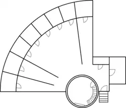 Built to a design adapted from Jeremy Bentham's Panopticon prison. This design is unique in the British Cape Colony. Designed to allow for constant surveillance of the prisoners. The prison is shaped as a quarter circle with eight cells, roughly 2m by 3m each, running along the curved arc of wall with the exercise area's for each cell radiating out from the double story watch tower, which has portals looking into each exercise area.[1]