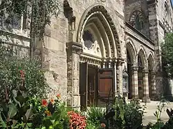 The church building was designed between 1870 and 1872 by the Boston architectural firm of Cummings and Sears in the Venetian Gothic style. The style follows the precepts of the British cultural theorist and architectural critic John Ruskin (1819–1900) as outlined in his treatise The Stones of Venice. Old South Church in Boston remains one of the most significant examples of Ruskin's influence on American architecture. The architects, Charles Amos Cummings and Willard T. Sears, also designed the Isabella Stewart Gardner Museum. The exterior of the church is primarily built of Roxbury Conglomerate commonly called puddingstone. Many arches, and several walls of stone, are striped with alternating courses of yellow-beige and deep red sandstone. The porticos and large open arches in the campanile are decorated with simple plate tracery. The upper arches of the porticos are decorated with screens of ornate wrought iron. The building is roofed in alternating bands of red and dark gray slate and the roofline finished with ornamental iron cresting.