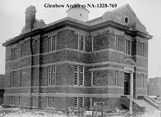 The original building was designed by the firm of Arthur G. Wilson and David E. Herrald.[3][8] Although a local duo, their design borrowed heavily from their British roots. It is a simplified English Renaissance Revival Style, common for commonwealth buildings of the Edwardian age. Although grand in appearance, with ionic columns and limestone cornices on the exterior and intricate carved wood on the interior, the design is far more simplified and streamlined than earlier buildings of the Victoria era. This is reflected in other nearby buildings of the same age, such as Old Scona Academic High School.