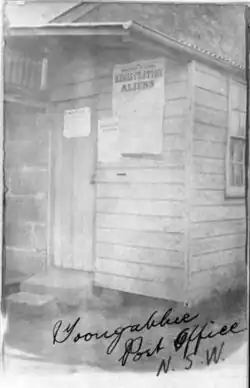 The first post office in the area was opened after many years of campaigning by local residents in 1887 in a private house on Old Windsor Road and this arrangement continued until the 1960s. The first post master was a Mr Birks wand he was paid 25 pounds a year to manage the office and bring the mail bag over from Seven Hills on horseback each day. By 1922 the number of residents and businesses had grown sufficiently to support a second office in a weatherboard cottage in Wentworth Avenue, known as Toongabbie West. A purpose built office was opened in the main shopping area in Portico Parade in 1960 becoming Toongabbie Post Office whilst the old Toongabbie Post Office was renamed Old Toon[6]