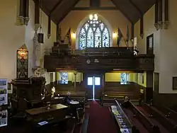 In 1872 the kirk was officially named the North Parish Church, but remained generally known as the Old West Kirk. The galleries were now more steeply sloped. The Cartsburn gallery was rebuilt in 1873, and an organ fitted there in 1874. Across the nave, the Schaw aisle, then called the Sir Michael's gallery, was built with its front now a low wall in line with the nave, about 2 feet (0.61 m) high, and was steeply raked with four pews rising up to the level of the door leading to its external stairway. There were now only two other outside doors to the church: one was added to the old mortuary which became a porch, and the main entrance door was now in the centre of the gable to the Cartsburn Aisle.[34]