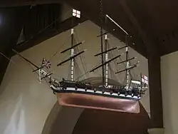 Greenock was boosted by the construction of its harbour in 1710, and the growth of shipbuilding began when John Scott's started building fishing boats on the east bank of the West Burn a year later.[23] By 1729 there were proposals to build a second church for the increasing population: from 1741 services were held in a large loft in the Royal Close, near Rue-End street. In 1758 work began in Cathcart Square on the Mid Kirk, which opened in 1761. At this time, the original church became known as the Old Parish Church, and later the West Parish Church. From 1774, more churches followed. [24][25] The walls of the West church were raised by about 3.5 feet (1.1 m) in 1767, prior to renewal of the roof. [26] A new Manse to the west was feued in 1787.[11] In the 1790s the pews were square.[2]