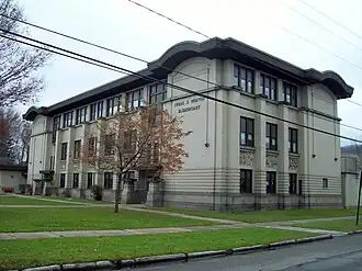 Olean School No. 10, now known as Ivers J. Norton School, is a historic school building located at Olean in Cattaraugus County, New York. It was designed and built in 1908–1909, in the Prairie School style. It is three stories, nine bays wide and four bays deep. It is constructed of brick and stone and topped with a flat roof with deep overhangs. It features "Boys" and "Girls" entrances and large brick engaged columns on the front facade.[2] It remained in operation as a school building until 2012, when it (along with the Boardmanville school) was closed as a result of budget cuts implemented in the wake of New York's property tax cap. In late 2014 the school was purchased by a pastor and turned into a church.