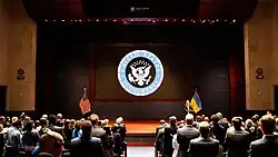 On 19 July 2022, Zelenska started her visit to the United States.[52] On the first day of the visit, Zelenska met with the US Secretary of State Antony Blinken, and Samantha Power, the Administrator of the United States Agency for International Development. On the second day of the visit, she held a meeting with the first lady of the United States, Jill Biden, at the White House.[53] Zelenska was also met on the porch of the White House by US President Joe Biden and Vice President Kamala Harris.[54]