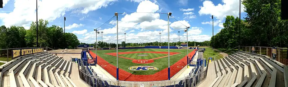 The first game at the current baseball field, which had no official name, was May 3, 1966 against the Ohio State Buckeyes.[3] Initial plans called for the new field to be adjacent to a new football stadium, but the stadium would later be built at a different site further east as Dix Stadium.[4] By 1969, the new varsity baseball field was referred to as Allerton Field as Allerton Street was nearest street at the time of the field's construction. It was a natural grass field with wooden bleacher seating for approximately 700 people. After the conclusion of the 1989 season, a grandstand was added behind home plate, replacing the original wooden bleachers and increasing the seating capacity to approximately 1,000. The project also included a press box, new concession stand, a warning track on the field, a new outfield fence, and updates to the infield, completed prior to the 1990 season.[5] In September 1989, the university named the field in honor of Kent State alumnus Gene Michael, who played and managed professionally in Major League Baseball.[6] It was formally dedicated April 23, 1990.[7]