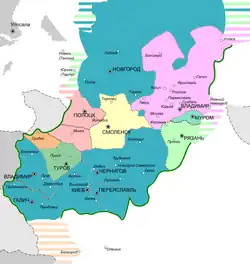 - ^ In 12th- and 13th-century Kievan Rus', the four dominant princely clans were the Olgovichi of Chernigov, the Rostislavichi of Smolensk, the Iziaslavichi of Volhynia (based in modern Volodymyr in Volyn'), and the Yurievichi of Suzdalia (alias the Vsevolodichi of Vladimir on the Klyazma).[1] 'Three of these clan founders – Vsevolod, Rostislav, and Iziaslav – were the grandsons of Volodimer Monomakh. The outlier from this set is Oleg, who was instead a cousin of Volodimer Monomakh.'[2]
