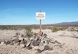 The Oatman family, traveling alone, was nearly annihilated in what became known as the "Oatman Massacre" on the banks of the Gila River 84 miles east of modern-day Yuma, Arizona.[8] The seven Oatman children ranged in age from one to 17 years old, the eldest being Lucy Oatman. Mary Ann was 8 months pregnant with their eighth child. On the Oatmans' fourth day out from Maricopa Wells, they were approached by a group of nineteen Native Americans who were asking for tobacco and food.[7] Due to the lack of supplies, Royce Oatman was hesitant to share too much with the small party of Yavapais. They became irate at his stinginess. During the encounter, the Yavapais attacked the Oatman family. The Yavapais clubbed the family to death. All were killed except for three of the children: 15-year-old Lorenzo, who was left for dead, while 14-year-old Olive and 7-year-old Mary Ann were taken to be slaves for the Yavapais.[8]