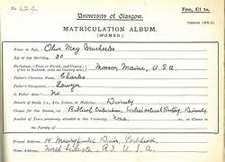 In 1909 Winchester broke a gender barrier as the first woman matriculated into the Bachelor of Divinity course at the University of Glasgow.[36][37] However, according to Ingersol, "More impressive was her record at the University of Glasgow, Scotland."[28] During this time Winchester won the Cook and McFarlan Testimonial Prize of £21,[38] awarded annually since 1847 in memory of Duncan Macfarlan, DD, Principal of the University of Glasgow (1823 to 1858), and George Cook, DD, Professor of Moral Philosophy in the University of St Andrews, to "the most distinguished candidate in Greek, Moral Philosophy, Hebrew, Ecclesiastical History and Divinity."[39]