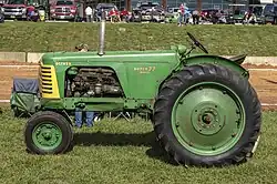 The Oliver Hart-Parr 70 was introduced in 1935, with emphasis on the "Oliver" brand. The 70 featured an unprecedented six-cylinder engine, with options for an electric starter and lights. The 70 was offered as a row-crop tractor with narrow front wheels, a standard tractor with a wide front axle, an orchard tractor with wheel skirting and a low profile, and a high-crop tractor with high clearance. The 200-cubic-inch (3,300-cubic-centimetre) displacement engine developed 33 horsepower (25 kW), with four and six-gear transmissions available. The HC engine ran on 70 octane gasoline, providing the "70" series designation. A KD version operated on kerosene and distillate fuel.The tractors were styled with automobile-like sheet metal full hood enclosures, giving them a streamlined look, and car-like controls. A competition was held to determine the 70's paint scheme, with voting at county fair exhibits promoting the tractor. Voting settled on a green body with red trim. The green body color was continued throughout Oliver production. The 70 line was manufactured at Oliver's Charles City, Iowa plant. Despite the 70's features, the model was outsold by the equally innovative and less expensive Ford 9N tractor.[1][2][3]