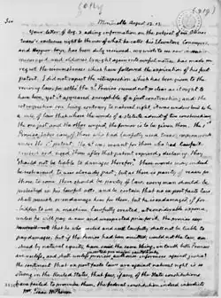 Evans found himself in battles to protect his intellectual property many times throughout his career, but he pursued the cause most doggedly during his latter years. His first and most successful patents concerning flour-milling proved the most problematic to defend, and Evans' battles proved influential in setting precedent for the newly established area of federal patent law. His original patent for his automated flour-mill expired in January 1805, but Evans believed that the fourteen year patent term was too brief and petitioned the Congress to extend it.[102] In January 1808 An Act for the Relief of Oliver Evans was passed and signed by President Jefferson, a long-time admirer of Evans's work. The act took the extraordinary step of reviving to Evans his expired patent and giving it another fourteen year term— Evans was delighted, but the move was to prove highly problematic, particularly regarding those who had implemented Evans's designs in the intervening three year period between the patent terms, as many millers had waited for Evans's patent to expire before upgrading their mills.[103]