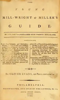 - ^ Evans would later write at length on his design vision:"[The machines] perform every necessary movement of the grain, and meal, from one part of the mill to another, and from one machine to another, through all the various operations, from the time the grain is emptied from the wagoner's bag ... until completely manufactured into flour ... without the aid of manual labor, excepting to set the different machines in motion."[16]