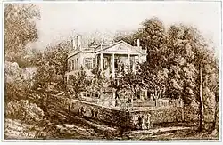 This house had originally been built by Henry A. Coster, the Dutch merchant, in about 1810. He planted the grounds with rare fruit, plants, trees, and it was said to have been one of the finest private gardens in North America. It was bought by Phelps in 1835 who then acquired adjoining properties, so that the land eventually extended from Third Avenue to the East River, and from Twenty-ninth to half-way between Thirty-third and Thirty-fourth streets. The house was of old Colonial architecture, with out-buildings, hothouses, a large conservatory of rare fruits and flowers, gardener's lodge, stabling, summer house and boat house. From the east portico there were views over the lawn, garden, pasture, and river. A cedar of Lebanon that shaded the ice-house was said to have been brought from Mount Lebanon by Henry Coster.[10]