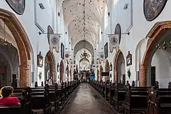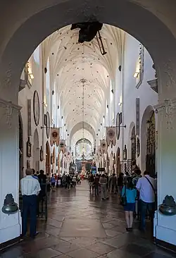 All 23 altars of the cathedral are of great historical value. They are mainly Baroque and Rococo, partly made of marble. Their iconography depicts the main principles of the post-Trent church. Most outstanding is the present High Altar (1688),[2] which is the most profound Baroque work of art in Pomerania; and the Netherland Renaissance style altar, which until 1688 played the role of the main one. The paintings in the altars, presbytery and main nave were made by the famous 17th- century artists: Herman Han (1574–1628), Adolf Boy (1612-1680), Andrzej Stech (1635–1697) and Andreas Schlütera (1660–1714). The interior also holds Rococo chapels of the Holy Cross and St John of Nepomuk, an ambo, tombstones, epitaphs, the Pomeranian Dukes tomb, the Kos family tomb, bishop's crypt, antique chandeliers, canopies, and many other antiquities, including a feretory of great cultural value, showing Our Lady of Oliwa with an Infant Jesus. The feretory is always carried during the annual walking pilgrimage to the Calvary of Wejherowo. The archcathedral holds organ concerts all year round and the beautifully restored monastery (now belonging to Gdańsk Seminary) displays the collection of the Diocesan Museum. Oliwa Cathedral is a very important place for the Kashubian culture.