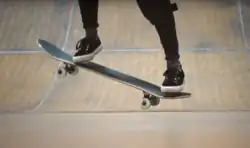 An April 1981 issue of Thrasher notes the vert ollie was quickly adapted to flatground use, observing that "skaters now hop effortlessly from street to sidewalk with just a tap of the tail."[4] In 1982, while competing in the Rusty Harris contest in Whittier, California, Rodney Mullen debuted an ollie on flat ground, which he had adapted from Gelfand's vertical version by combining the motions of some of his existing tricks. Mullen used a "see-saw" motion, striking the tail of the board on the ground to lift the nose, and using the front foot to level the board in mid-air.[2] While Mullen was not initially impressed with his flat ground ollie, and did not formally name it, the trick is now considered to have transformed the practice of skateboarding. Mullen himself realized it opened up a second, elevated plane on which to perform tricks, stating that "Skating might easily have petered out due to lack of progress if nobody had invented this trick."[5]