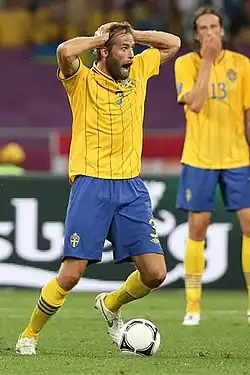 On 4 September 2006, Mellberg, along with Zlatan Ibrahimović and Christian Wilhelmsson, was sent home from the national squad for breaking an 11 pm team curfew ahead of a European Championships qualifier against Liechtenstein.[37] On 7 October, he returned to the lineup for their European Championships qualifier against Spain, which they won 2–0.[38] In the 2012 European Championships, Mellberg was involved in two goals in their match against England in the group stages to give Sweden a 2–1 lead, however, Sweden went on to lose 2–3[39] while Mellberg became "Man of the Match".[40] After the tournament, Mellberg decided to end his international career.[30]