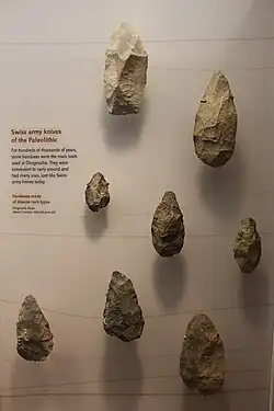 Human tools are the most prominent of all historic items in the area. The abundant hand axes are characteristic of the Acheulean period, made by hominins between about 600,000 and 900,000 years ago[7]along what was then the shore of a now dried-up lake. Fossils of various animals have also been found, including those of extinct species of hippo, elephant, zebra, giraffe, and baboon, likely to have been butchered with the aid of the hand axes.[1][3]